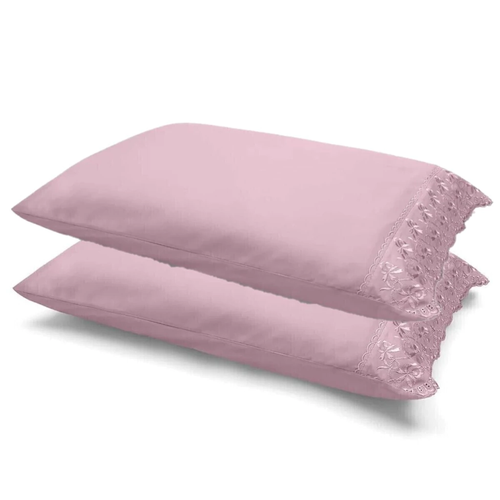 Fronhas sem abas e com faixa rendada proporcionando um acabamento mais elegante no conjunto.