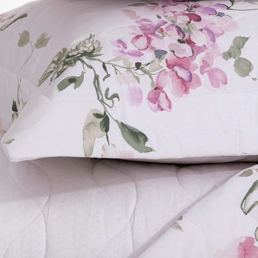 O Jogo de Colcha Wisteria é a personificação da elegância italiana, confeccionado em cetim 200 fios de 100% algodão, com estampas deslumbrantes que capturam a essência da primavera em Cinque Terre, desenvolvidas com a Arte Fatto à Mano. Cada peça é uma obra de arte pintada à mão, trazendo para o seu ambiente o charme das flores em tons vibrantes e aquarelados, desenvolvidas na pitoresca costa do Lago de Como. A colcha e os porta-travesseiros dupla face oferecem versatilidade e sofisticação, permitindo criar diferentes composições no quarto.