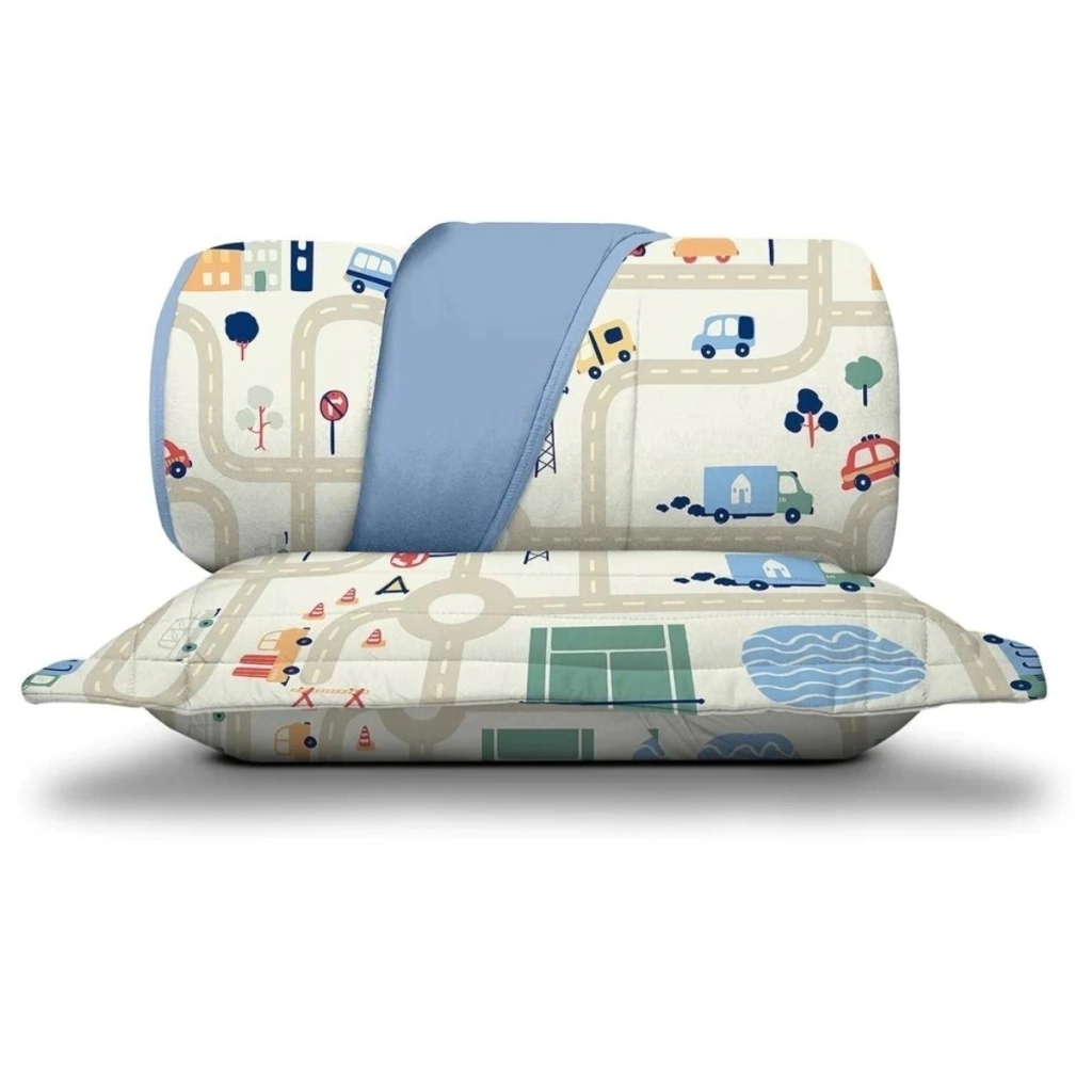 Cobre Leito Dupla Face, um lado com estampa auto pista e do outro lisa azul.