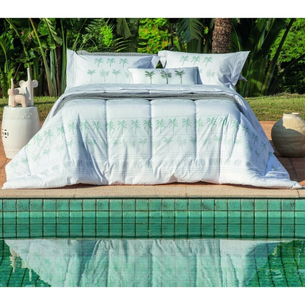 O Kit Edredom Dabu é confeccionado em Tecido 100% Algodão 200 Fios, proporcionando um toque suave e fresquinho, conseguindo atender as necessidades térmicas de todas as estações do ano. A coleção mescla elementos típicos da fauna e flora indiana, como coqueiros e elefantes, utilizando as cores Branco, Cinza e Verde, resultando em uma estampa moderna e contemporânea.